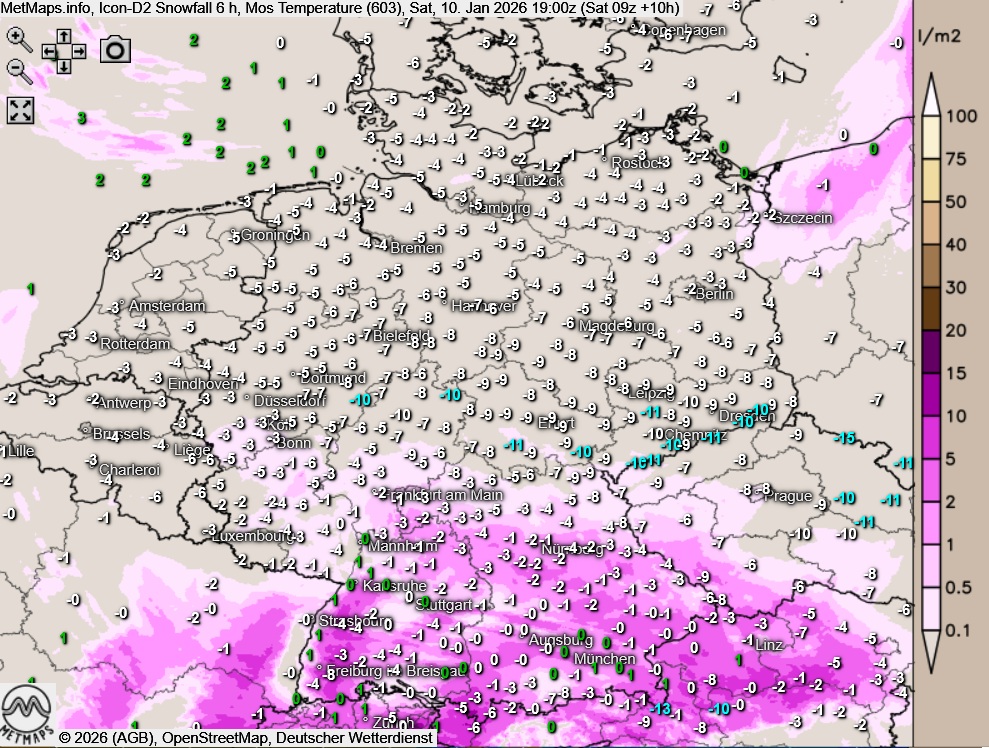 Die Sechs-Stunden-Schnefallmengen bis 19:00 Uhr sowie die Temperaturkarte für 23:00 Uhr: