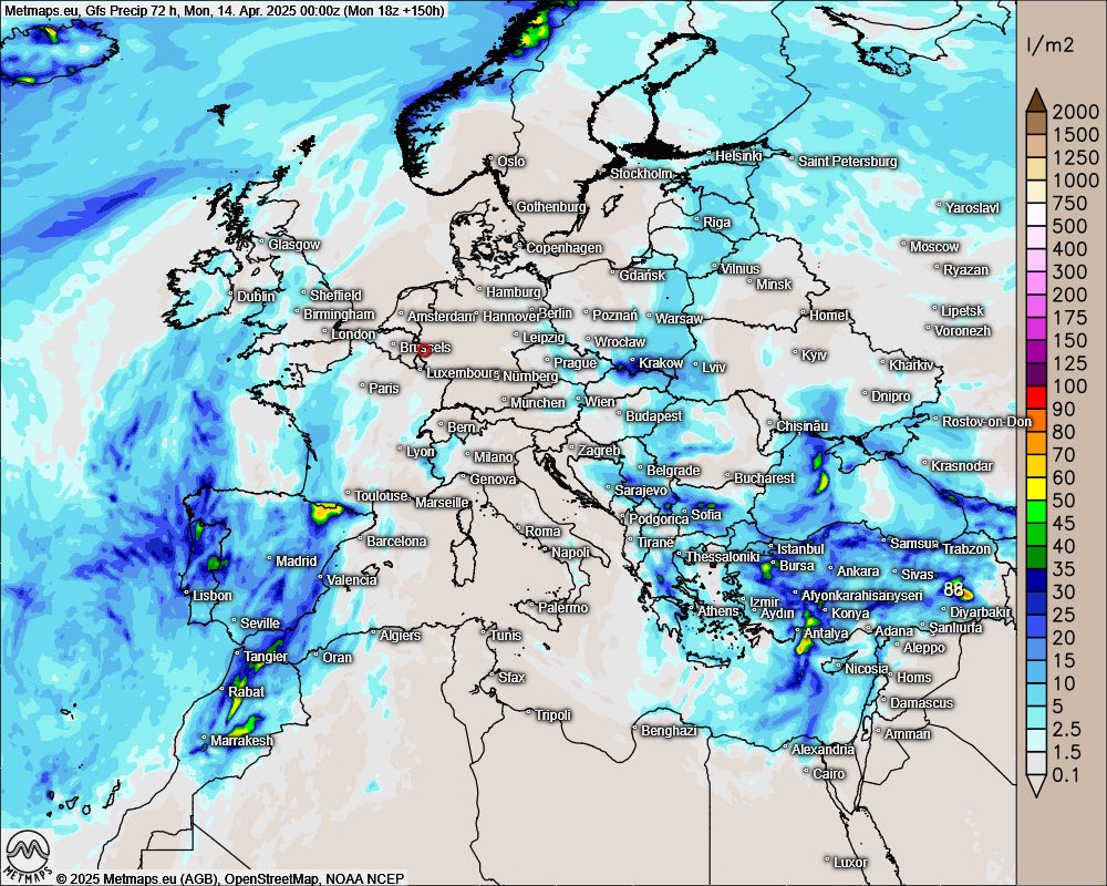 Der AI-ECMWF-Modelllauf prognostiziert etwas Regen für den Nordwesten. Das US-Modell GFS ist da viel vorsichtiger und lässt bis zum 15.4. nur wenig Regen aufkommen.