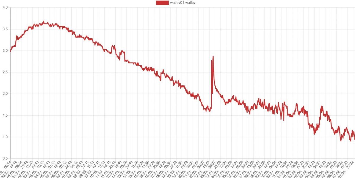 Ganz trocken gefallen ist sie zwar noch nicht, aber das „Zittern“ des Pegelstandes auf knapp einen Zentimeter deutet schon auf mangelnden Wassernachschub hin. Die Schüttung beträgt aktuell vielleicht noch 0,3 bis 0,5 l/s.