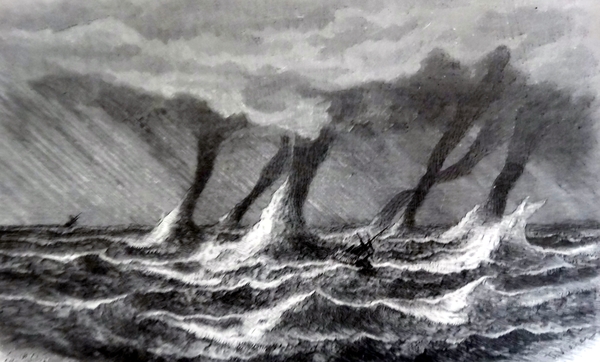 Abb.: Mehrere Tornados über dem Meer, antiker Stich, um 1880.