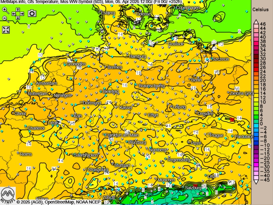 Das GFS-Modell bleibt bei der milderen Variante: Sowohl für den Ostersonntag als auch für den Ostermontag prognostiziert das Modell auf der Fläche angenehme Temperaturen. Der Ostermontag sticht dabei besonders hervor – mit Höchstwerten um 16 Grad wäre er der freundlichere und mildere der beiden Tage. Niederschlag ist nach aktuellen Berechnungen kein Thema.