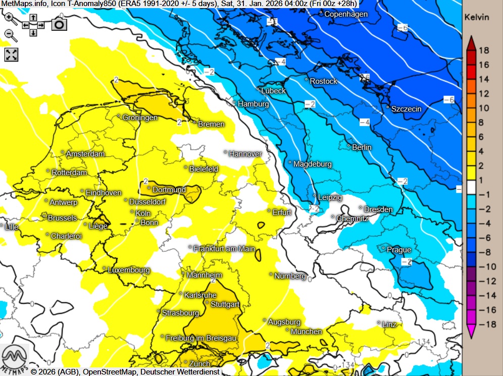 Die Luftmassengrenze verläuft weiterhin quer über das Bundesgebiet und sorgt für markante Temperaturgegensätze. Am Samstag und Sonntag werden dabei Unterschiede von bis zu 15 Grad Celsius zwischen den kalten und den milden Regionen erwartet.