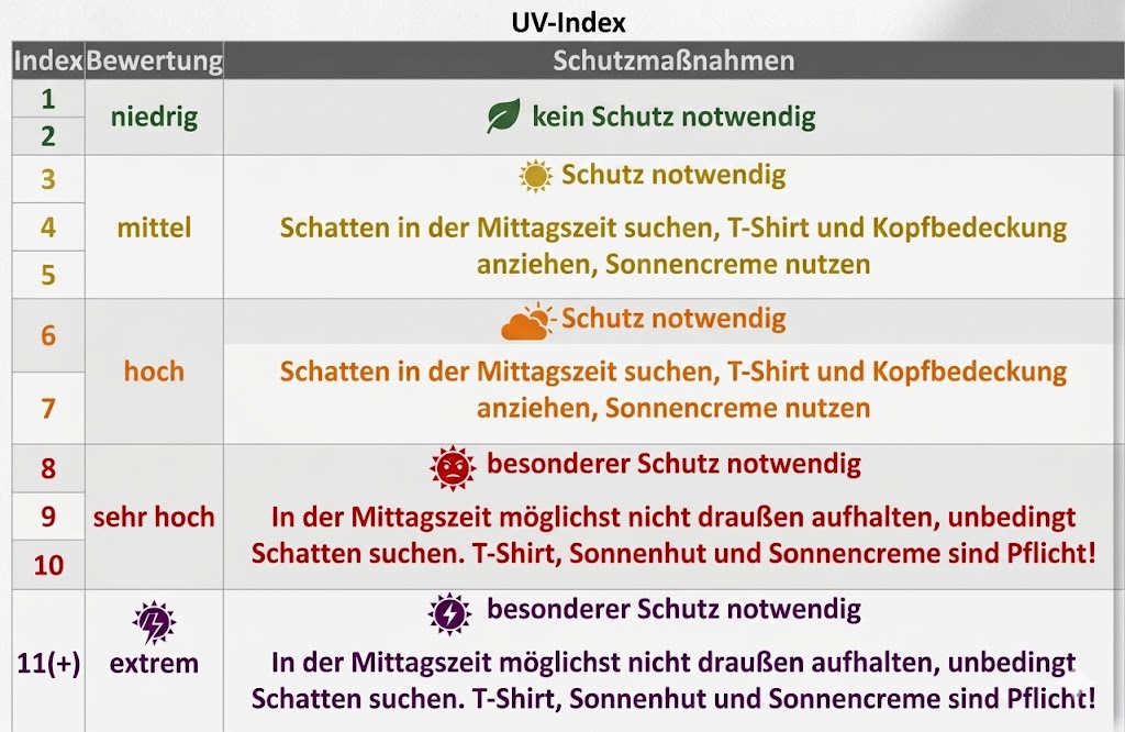 Ende April steht die Sonne zudem bereits so hoch am Himmel wie Mitte August. Der Weg der Strahlen durch die Atmosphäre ist kürzer, was die Intensität massiv erhöht. Der UV-Index (s. Grafik) erreicht in diesen Tagen in Deutschland oft schon Werte von 4 bis 6 – das entspricht einer mittleren bis hohen Belastung.