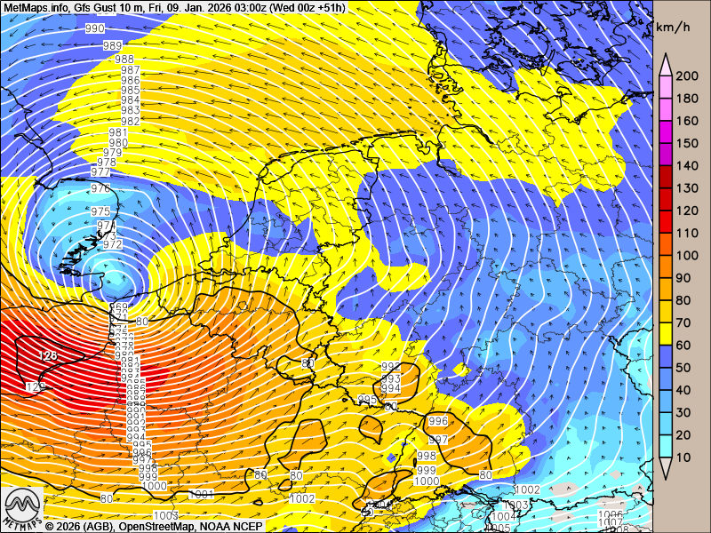 Die Böenkarte für Freitagnacht, die Sechs-Stunden-Niederschläge bis Freitagnachmittag sowie die Schneehöhe Samstagfrüh nach GFS: