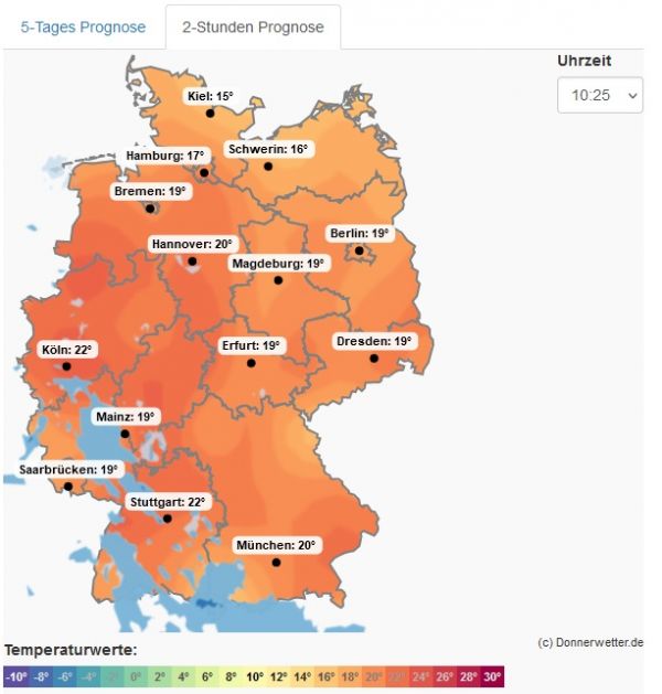 Am Donnerstag und Freitag kommen die Schauer und Gewitter dann auch in die Osthälfte voran – was dann passiert, ist noch nicht ganz klar. Wir haben es mit einer Grenzlage zu tun: Das Tiefdruckgebiet trifft auf das stabile Hoch, daher gibt es hier zum jetzigen Zeitpunkt noch viele Unbekannte - auch was das Wetter über die Pfingsttage betrifft.