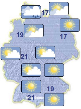 Am Montag ist es verbreitet heiter oder sonnig, lockere Wolkenfelder ziehen meist nur in der Nordhälfte und in Küstennähe durch. Bei Höchstwerten zwischen 21 und 24 Grad bleibt es häufig trocken.