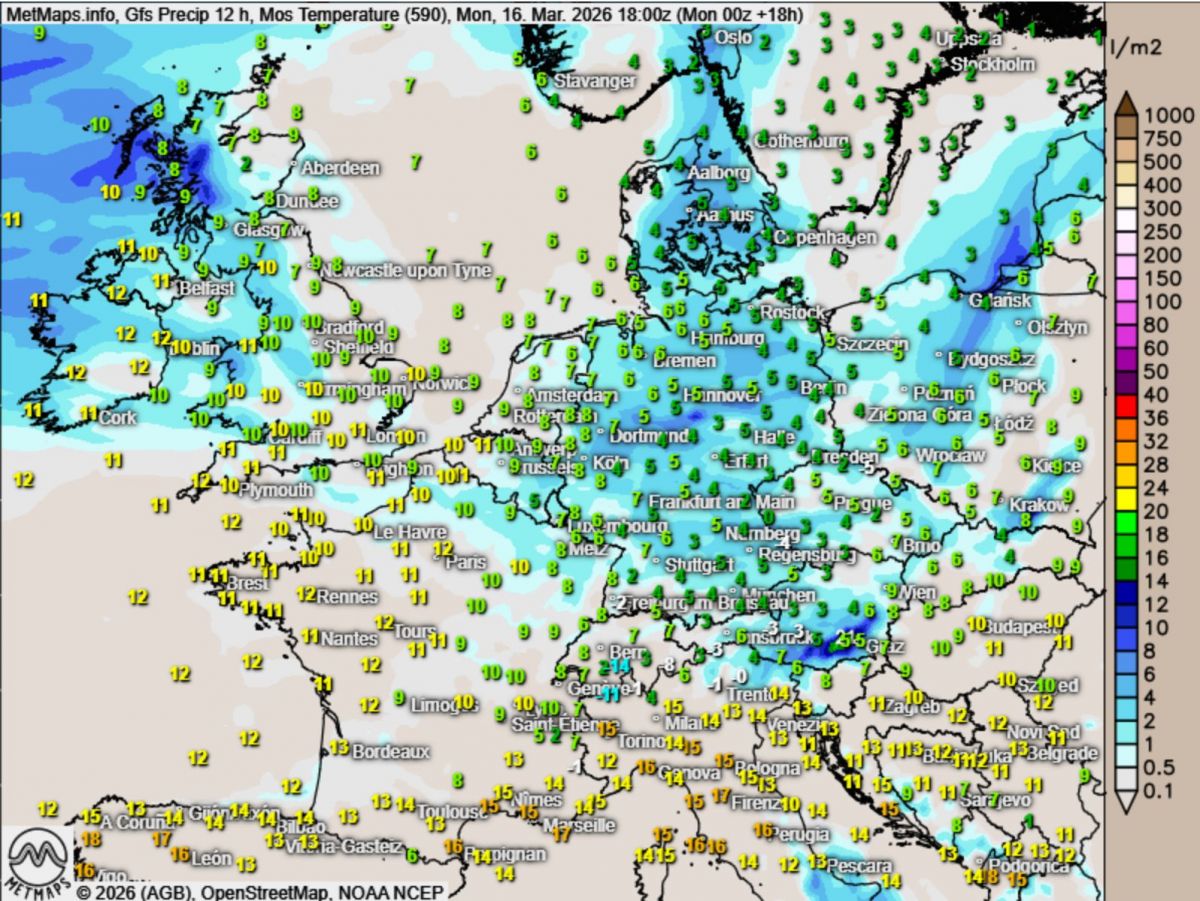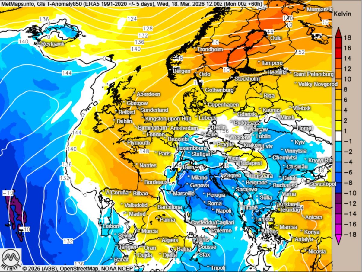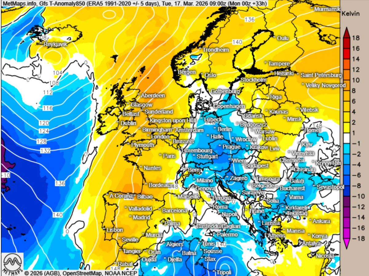 Der Übergang zur wärmeren Frühlingsluft verläuft allerdings zögerlich. Grund dafür ist eine Kaltluftblase, die sich weiterhin über Nord- und Ostdeutschland hält und die Erwärmung bremst. Dadurch bleiben die Temperaturunterschiede innerhalb Deutschlands zunächst deutlich.