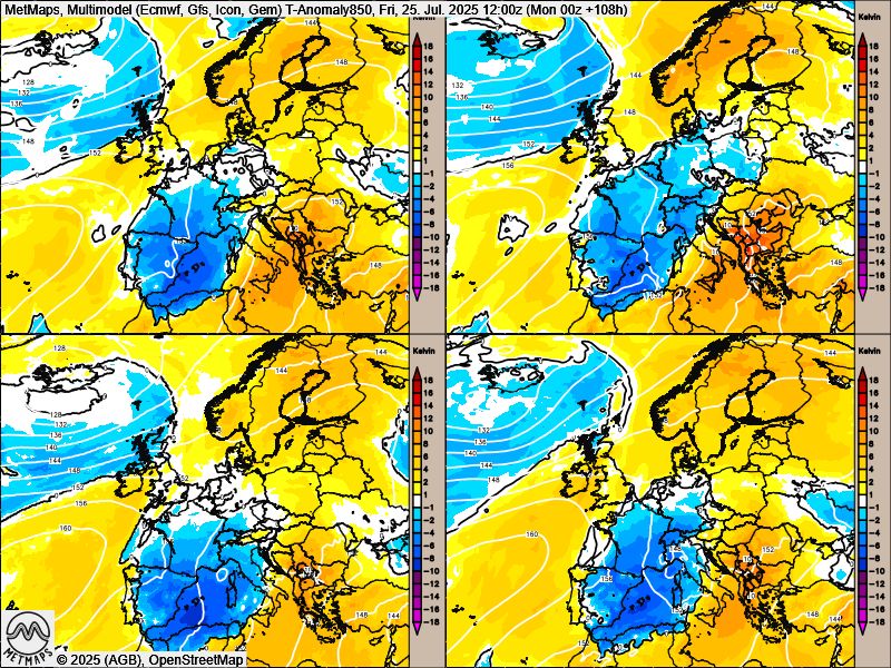 Zur Einordnung haben wir für Euch aktuelle Multimodellkarten mit den Temperaturabweichungen in Europa für Freitag und Montag vorbereitet. Und was sieht man? Extreme Hitze in Deutschland zumindest nicht.