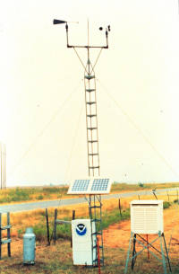 Bild: Solarbetriebene Wetterstation des amerikanischen Wetterdienstes. Am Mast werden Windrichtung und -geschwindigkeit gemessen, im weißen Kasten Temperatur, Luftfeuchtigkeit und Luftdruck. Der Regenmesser steht links des Masts. NOAA Photo Library.