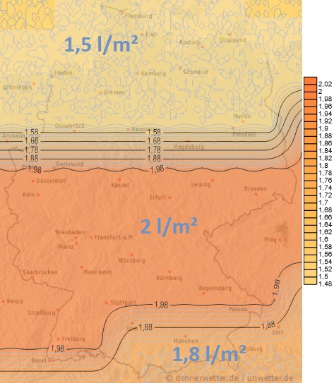 Am Mittwoch ziehen im Tagesverlauf im Westen teils kräftige gewittrige Regengüsse auf. Die Niederschlagsmengen können örtlich über 20 Liter pro Quadratmeter erreichen.