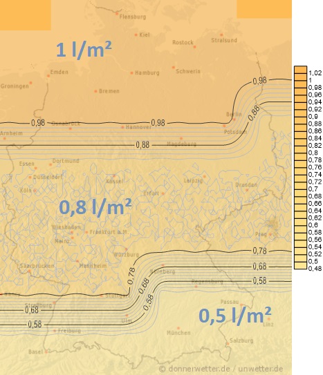Heute muss ganz im Süden noch mit kräftigen Regenfällen mit Mengen zwischen 25 du 50 Liter pro Quadratmeter gerechnet werden, sonst treten vor allem im Südwesten Schauer und örtliche Gewitter mit Niederschlagsmengen zwischen 2 und 10 Liter pro Quadratmeter auf.