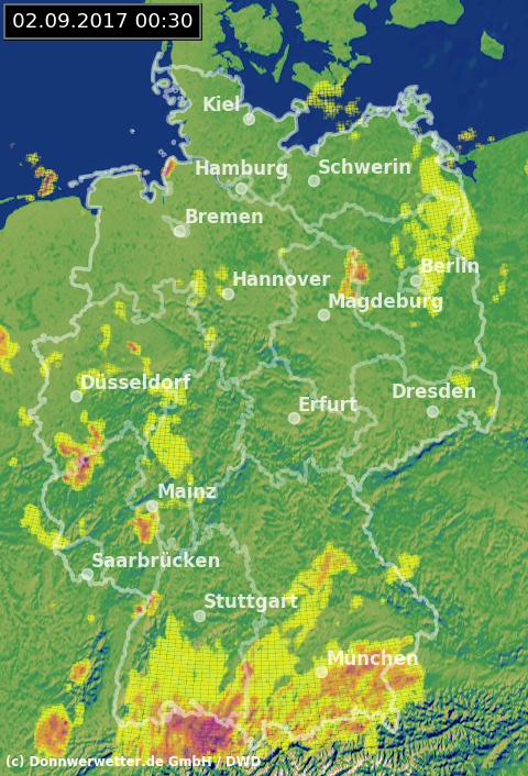 Das Radarbild zeigt momentan vor allem im Bodenseebereich, sowie am Alpenrand teils stärkere Niederschlagssignale. Sonst erkennt man örtliche Schauersignale. Oft ist der Himmel über Deutschland von Wolken überzogen, nur gebietsweise sind die Sterne zu sehen. Stellenweise haben sich Nebelfelder gebildet.