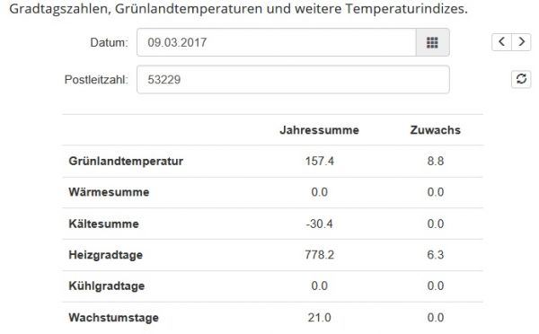 Damit Sie diese Berechnung nicht selbst von Hand durchführen müssen, übernimmt dies eines unserer neuen Service-Tools automatisch für Sie. Sie müssen bloß noch Ihre Postleitzahl eingeben und schon erhalten Sie neben der Grünlandtemperatursumme auch die Wärme- und Kältesumme sowie die Heizgrad- , Kühlgrad- und Wachstumstage. Und das tagesaktuell und mit rückblickender Kalenderfunktion.