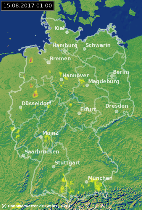 Heute wird es oft sehr warm und schwül, nachmittags ziehen von Westen verbreitet Regengüsse und Gewitter auf, die örtlich auch wieder kräftig ausfallen können und in der Nacht auch die östlichen Landesteile und Bayern erreichen. Dabei können örtlich über 20 Liter pro Quadratmeter fallen.