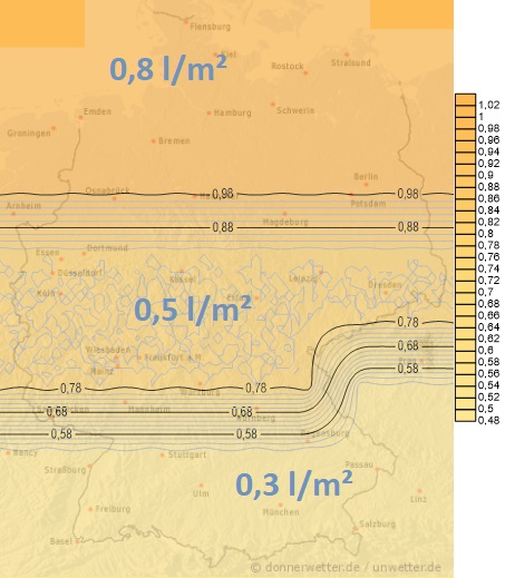 Heute entwickeln sich mit sonniger Einstrahlung wieder örtliche Schauerwolken, vereinzelt auch mit Blitz und Donner. Die Niederschlagsmengen liegen dabei meist zwischen 1 und 10 Liter pro Quadratmeter. Trocken bleibt es vermutlich im Nordosten. Gegen Abend zieht von Ostfrankreich ein kleines Regengebiet nach Baden-Württemberg rein.
