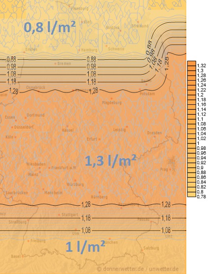 Am Dienstag muss ebenfalls mit Schauern und örtlichen Gewittern gerechnet werden. Dabei sind Mengen zwischen 2 und 10 Liter pro Quadratmeter zu erwarten.