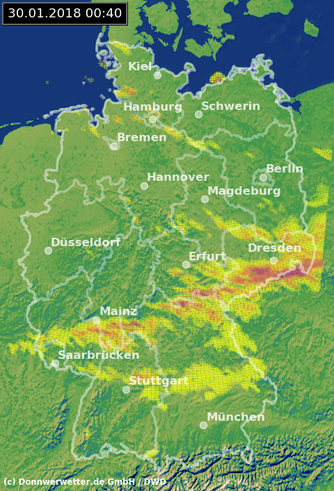 Das Radarbild zeigt aktuell Signale mit Regen, der über der Südhälfte angelangten und sich abgeschwächte Kaltfront. Über dem Norden erkennt man einige Schauersignale. Sonst ist der Himmel über Deutschland überwiegend wolkenverhangen. Am Alpenrand, sowie im Nordwesten auf der Rückseite der Front zeigen sich aber auch die Sterne. Vereinzelt halten sich Nebelfelder.