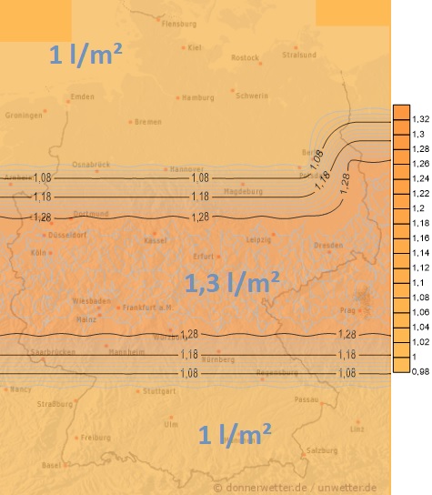 Heute ziehen von Westen örtliche Regengüsse und Gewitter auf. Dabei sind Niederschlagsmengen zwischen 2 und 8 Liter pro Quadratmeter zu erwarten.