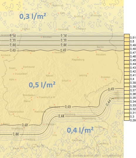 Am Mittwoch und Donnerstag muss gebietsweise mit Regen oder Schauern gerechnet werden, im Bergland, sowie im Norden kann es zunächst noch schneien. Die Niederschlagsmengen liegen dabei häufig zwischen 5 und 20 Liter pro Quadratmeter.