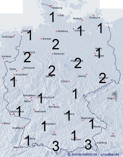 In Teilen Norddeutschlands und über den Mittelgebirgen kann es stellenweise etwas regnen, oder zu leichten Schauern kommen. Hier liegt die Benetzungsdauer zwischen 1 und 3 Stunden. Sonst entsteht leichte Benetzung durch nächtlichen Strahlungstau.