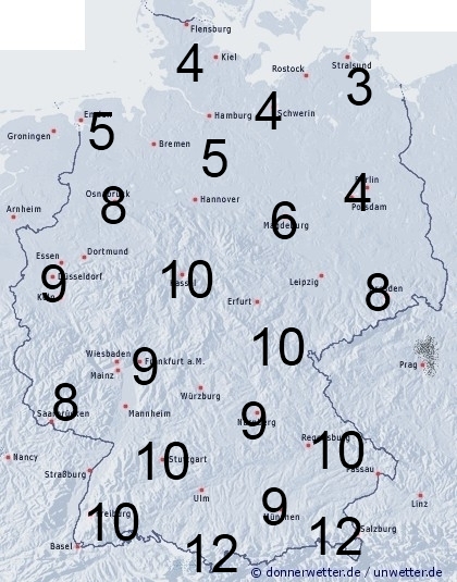In Deutschland muss gebietsweise mit zum Teil kräftigen Regengüssen und Gewittern gerechnet werden. Sonst entsteht leichte Benetzung durch nächtlichen Tau. Die Benetzungsdauer liegt allgemein zwischen 5 und 12 Stunden. In den niederschlagsfreien Gegenden, also hauptsächlich im Nordosten werden nur 3 bis 4 Stunden erreicht.
