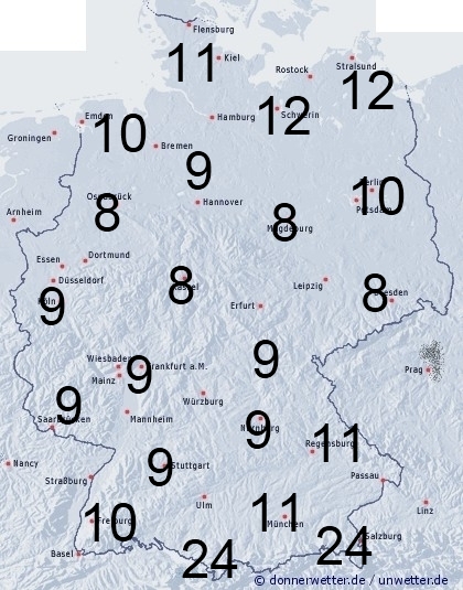 In Deutschland treten gebietsweise Niederschläge oder Schauer auf, die im Norden, sowie im Bergland noch als Schnee fallen können. Sonst entsteht Benetzung durch Feuchtigkeit wie Tauansatz. Die Benetzungsdauer liegt allgemein zwischen 8 und 13 Stunden, bei einer vorhandenen Schneedecke können bis 24 Stunden erreicht werden.