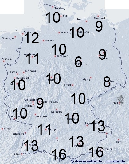 Über Deutschland ziehen Niederschläge und Schauer hinweg, die teilweise als Schnee oder Regen fallen. Vereinzelt gibt es auch kurze Gewitter mit Graupel. Die Benetzungsdauer liegt allgemein zwischen 8 und 12 Stunden, im Schwarzwald und im Alpenvorland zwischen 12 und 16 Stunden. Bei einer vorhandenen Schneedecke in den Bergen können bis zu 24 Stunden erreicht werden.