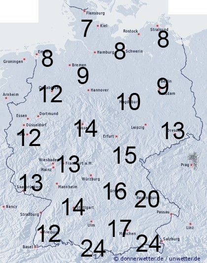 Vor allem in der Mitte und im Süden fällt häufig Regen oder Sprühregen. Nur in höheren Lagen des Bayrischen Waldes und an den Alpen gehen die Niederschläge noch in Form von Schnee oder Schneeregen nieder. Die Benetzungsdauer liegt in der Nordhälfte von Deutschland zwischen 7 und 13 Stunden, in der Südhälfte zwischen 13 und 20 Stunden. Bei einer vorhandenen Schneedecke werden bis zu 24 Stunden erreicht.
