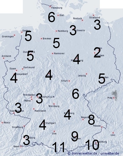 In Deutschland treten in manchen Gebieten örtliche Regengüsse auf. Sonst entsteht leichte Benetzung durch nächtlichen Strahlungstau. Die Benetzungsdauer liegt allgemein zwischen 2 und 5 Stunden, bei Schauern können auch zwischen 5 und 8 Stunden, am Alpenrand auch bis zu 11 Stunden erreicht werden.