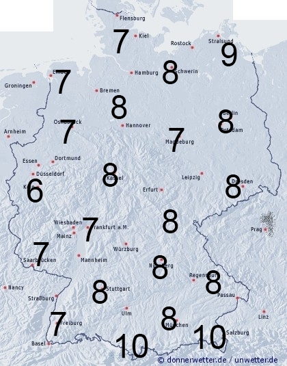 In Deutschland kann es stellenweise etwas regnen, sonst entsteht Benetzung durch Feuchtigkeit wie Tau- oder Reifansatz. Die Benetzungsdauer liegt allgemein zwischen 6 und 10 Stunden, kann jedoch außerhalb von Ortschaften in geschützten Lagen nach oben abweichen. Bei einer vorhandenen Schneedecke in den Bergen können bis zu 24 Stunden erreicht werden.