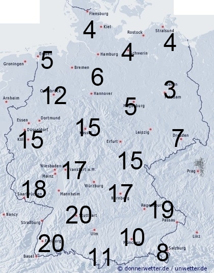 Vor allem in der Südwesthälfte fällt häufig Regen, teilweise auch schauerartig verstärkt und örtlich mit Blitz und Donner. Im Nordosten bleibt es überwiegend niederschlagsfrei und leichte Benetzung entsteht durch nächtlichen Strahlungstau. Die Benetzungszeit liegt im Nordosten daher nur zwischen 3 und 6 Stunden, sonst meist zwischen 6 und 15 Stunden, regional können im Südwesten, sowie im Bayrischen Wald auch bis 20 Stunden erreicht werden.
