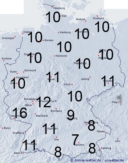 Mit auffrischendem Wind zieht ein Regengebiet im Tagesverlauf von West nach Ost über Deutschland hinweg. Außerdem entsteht Benetzung durch nächtlichen Strahlungstau und Nebelnässe. Die Benetzungsdauer liegt allgemein zwischen 10 und 16 Stunden. Lediglich in Bayern bleibt es tagsüber noch die längste Zeit trocken, daher erreicht die Benetzungszeit hier meist unter 10 Stunden.