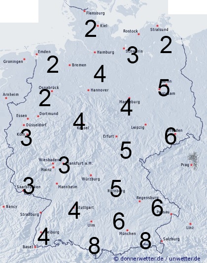 Regen und Schauer sorgen für eine Benetzungsdauer von 2 bis 8 Stunden. Die höheren Werte werden in der Südhälfte erreicht.
