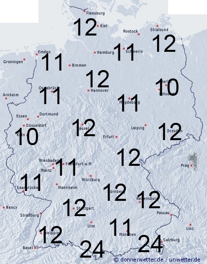 In Deutschland bleibt es überwiegend freundlich. Im Laufe des späten Abends zieht von Westen wahrscheinlich neuer Niederschlag auf. Sonst entsteht Benetzung durch nächtlichen Strahlungsreif. Die Benetzungsdauer liegt allgemein zwischen 9 und 13 Stunden, kann jedoch außerhalb von Ortschaften in geschützten Lagen nach oben abweichen. Bei einer vorhandenen Schneedecke werden bis zu 24 Stunden erreicht.