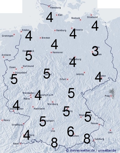 In Deutschland treten immer noch örtliche Schauer auf. Sonst entsteht Benetzung durch nächtlichen Strahlungstau. Die Benetzungsdauer liegt allgemein zwischen 3 und 8 Stunden.