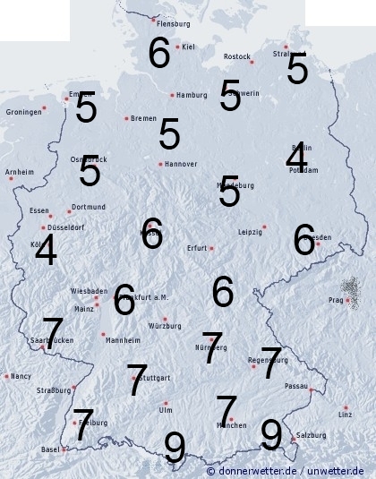 Ein Hoch sorgt in Deutschland für ruhiges Wetter. Lediglich über den Norden ziehen noch dichtere Wolken, Regen fällt jedoch kaum. Sonst entsteht Benetzung durch Nebelnässen und Tau. Die Benetzungsdauer liegt allgemein zwischen 4 und 9 Stunden, kann jedoch in geschützten Gebieten außerhalb von Ortschaften deutlich nach oben abweichen.