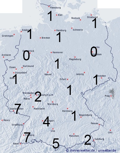 Im Tagesverlauf kommen von Rheinland-Pfalz bis zum Allgäu Regenfälle auf. Daher erreicht hier die Benetzung 4 bis 7 Stunden. Sonst bleibt es meistens trocken. Leichte Benetzung entsteht nur durch nächtlichen Strahlungstau.