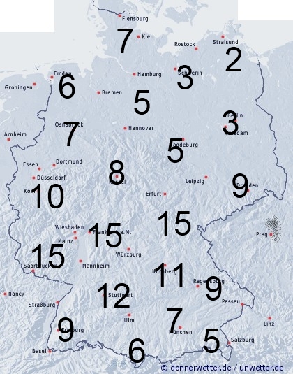 Vor allem in den mittleren Landesteilen fällt zum Teil kräftiger Dauerregen. Sonst regnet es gelegentlich, oder es treten Schauer auf. Im Nordosten bleibt es häufig auch trocken. Die Benetzungsdauer liegt in Mecklenburg-Vorpommern, sowie in Brandenburg meist nur zwischen 2 und 4 Stunden, sonst sind es 5 bis 12 Stunden und vom Saarland bis Thüringen können auch 15 Stunden erreicht werden.