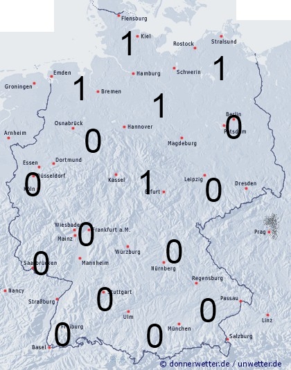 Die Benetzungsdauer liegt bei einer trockenen Ostströmung in ganz Deutschland zwischen 0 und einer Stunde.