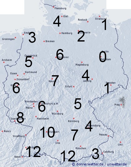 Gelegentlich fällt Regen, örtich gehen auch teils kräftige Schauer und Gewitter nieder, daher herrscht in Deutschland unterschiediche Benetzung von 3 bis 12 Stunden. Trocken bleibt es vermutlich nur im Nordosten.