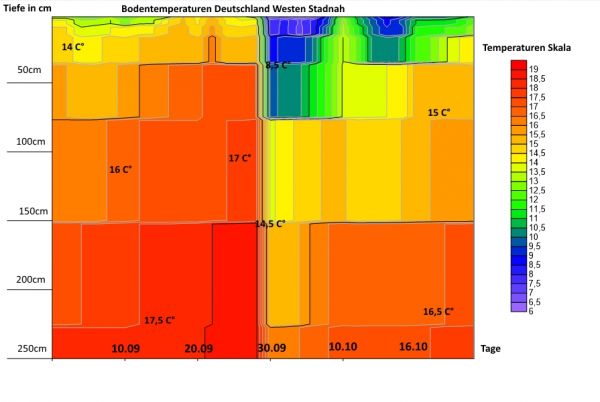 Zum ersten mal erscheint der Bericht über die Bodentemperaturen in Deutschland. Dies wird jetzt wöchentlich Dienstag um 08:00 Uhr erscheinen um Ihnen einen Überblick über die Tempereraturen unter unseren Füßen zu beschaffen. Diese sind natürlich wichtig für das Wachstum unserer Pflantzen.  In dieser Skala können Sie die Bodentemperaturen für etwas einen Monat zurück ablesen. Es wird Ihnen die Tiefe angezeigt. Wie viel Grad C es in der jeweiligen Tiefe ist können Sie anhand des Temperaturen Balkens, rechts von der Skala, ablesen.
