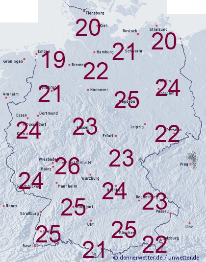 Ganz im Norden, sowie in den Bergen bewegen sich die Temperaturen im Erdboden im Bereich der 20 Grad - Marke. Weiter im Landesinneren und vor allem im Süden findet man aber warme Böden von 23 bis 25 Grad. Im Rhein - Main - Gebiet, sowie im Rhein - Neckar - Raum erreichen die Temperaturen in den Böden sogar 25 bis 27 Grad.