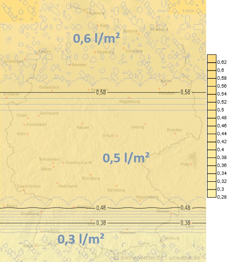 Am Donnerstag und Freitag gehen die Temperaturen noch etwas zurück, so dass es auch im Flachland zu Schnee oder Schneeregen kommen kann. Dabei sind weiterhin Mengen zwischen 1 und 10 Liter pro Quadratmeter möglich.