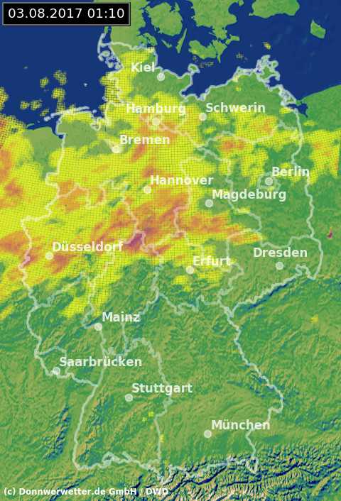 Das Radarbild zeigt aktuell in der Nordhälfte gebietsweise leichte bis mäßige Regensignale. Sonst ist es trocken. Vor allem im Süden ist der Himmel oft nur leicht bewölkt oder sternenklar. Stellenweise haben sich einzelne Nebelfelder gebildet.
