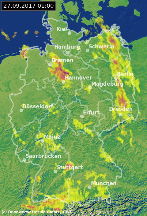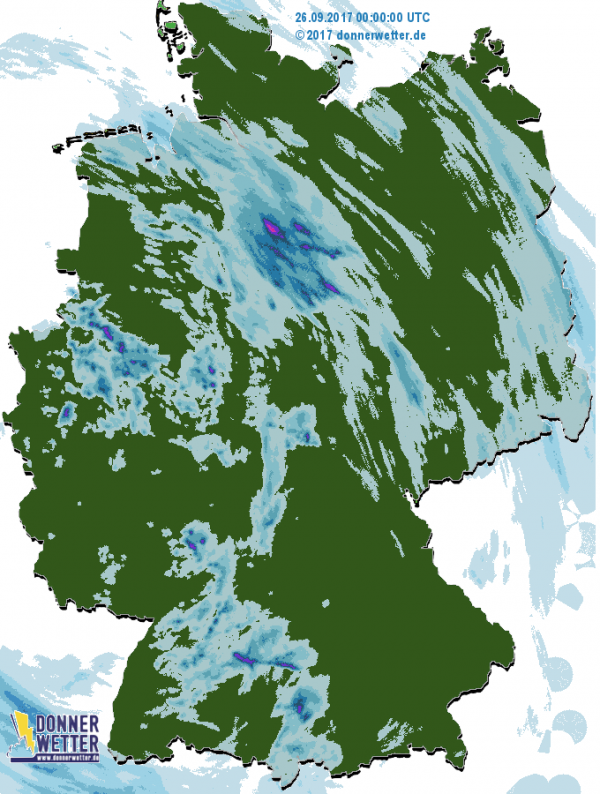 Das Radarbild zeigt aktuell noch gebietsweise Niederschlagssignale. Aus einem intensiveren Schauerecho zwischen Bremen und Hannover blitzt und donnert es aktuell auch noch. Sonst ist der Himmel über Deutschland momentan teils wolkenverhangen, teils sternenklar oder leicht bewölkt. Stellenweise haben sich Nebelfelder gebildet.