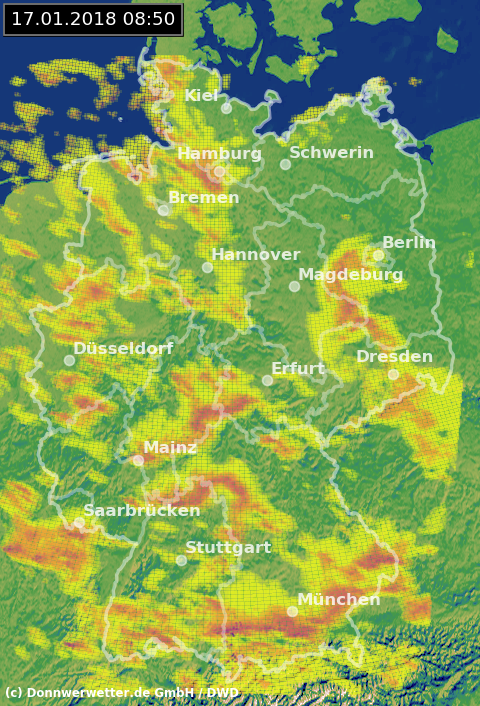 Das Radarbild von gestern zeigt zahlreiche Schauersignale mit teils kräftigen Regen- und Schneeschauern. Sonst war der Himmel über Deutschlands überwiegend wolkenverhangen, zwischendurch zeigte sich aber auch die Sonne.