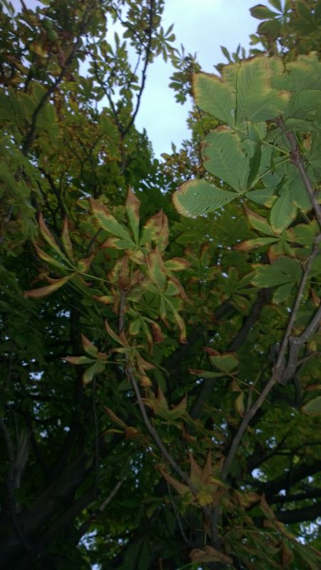 Durch Bakterium befallene Kastanie - erkennbar an den hellen Laubverfärbungen