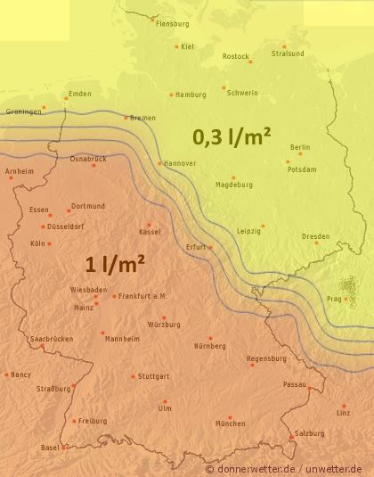 In einem Streifen von Baden-Württemberg bis nach Mecklenburg-Vorpommern fiel gestern Niederschlag. Im Nordosten wurden örtlich über 5 Liter / m² gemessen.