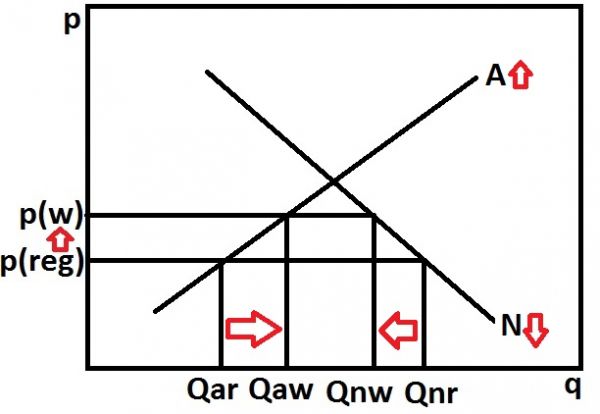 Würde das regionale Preisniveau (p(reg)) in der Markt-Theorie von heute auf morgen auf Weltpreisniveau (p(w)) herangezogen, würde die Nachfrage (N) in der Menge (q) sinken und das Angebot (A) steigen, sowie Importe wären geringer.