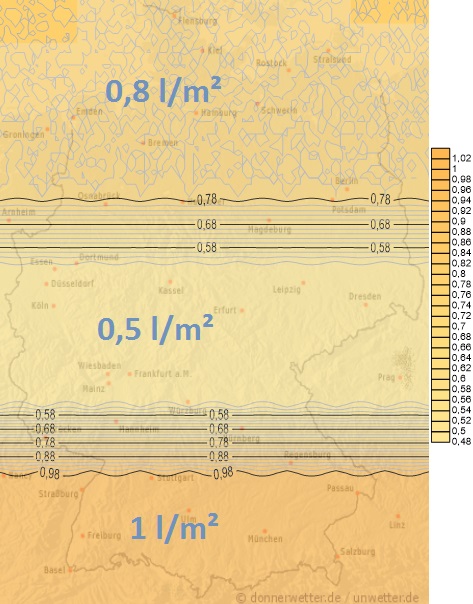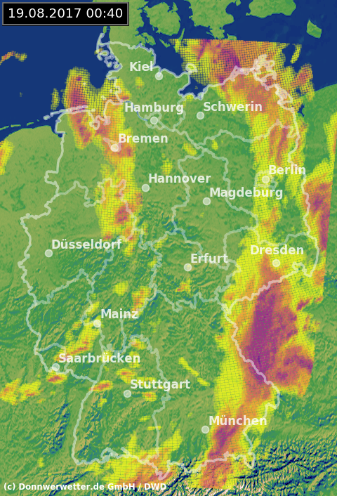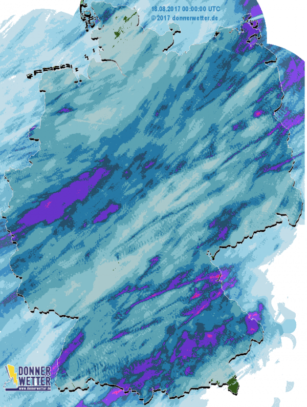 Das Radarbild zeigt aktuell nach Osten abziehende teils starke Regensignale und eine weitere über dem Westen liegende Staffel mit örtlicheren Regengüssen. An der Nordsee blitzt und donnert es auch noch vereinzelt. Außerdem schieben sich aus den Schweizer Alpen heraus neue stärkere Signale, die nach Bayern ziehen. In Fürstenzell bei Passau fielen zwischen 23.00 Uhr und 00.00 Uhr beachtliche 40,8 Liter Niederschlag pro Quadratmeter. Sonst ist der Himmel über Deutschland teils bewölkt, teils aber auch aufgeklart.